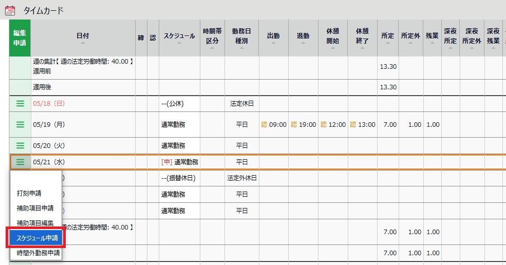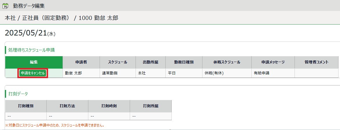 承認前に限り、スケジュール申請画面より、各種申請を取り消すことができます。