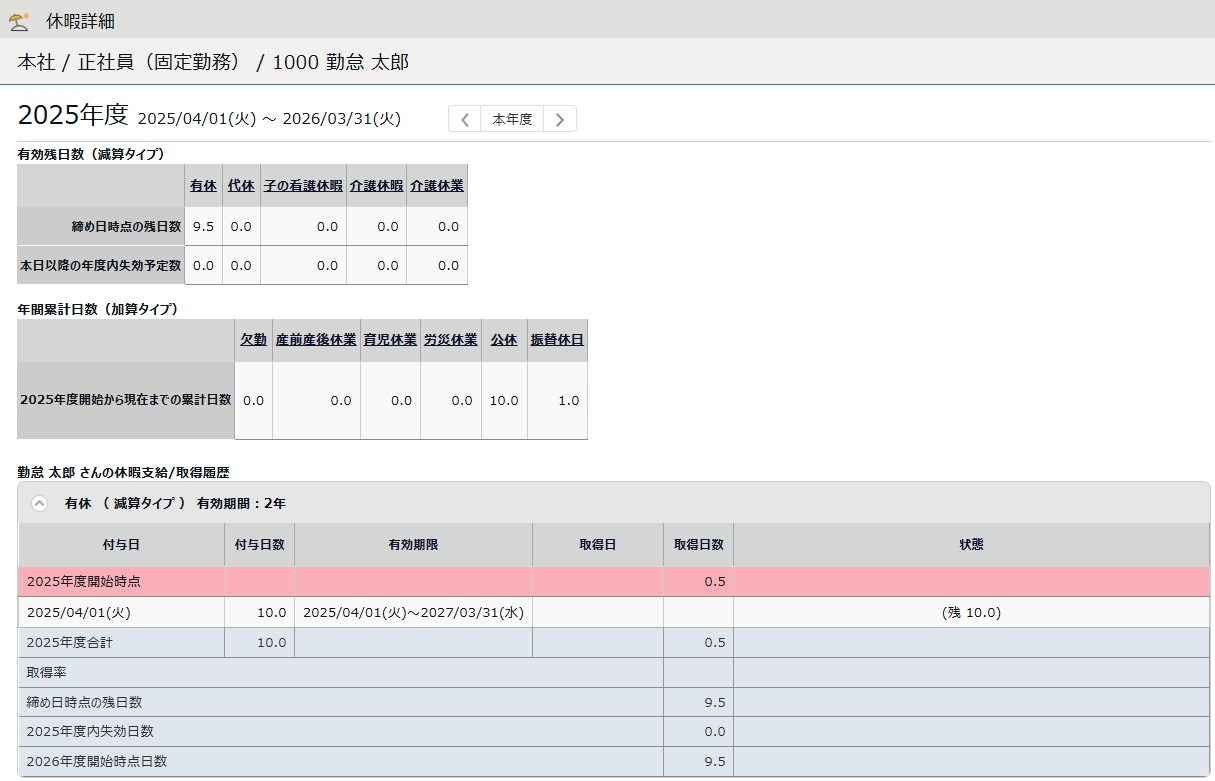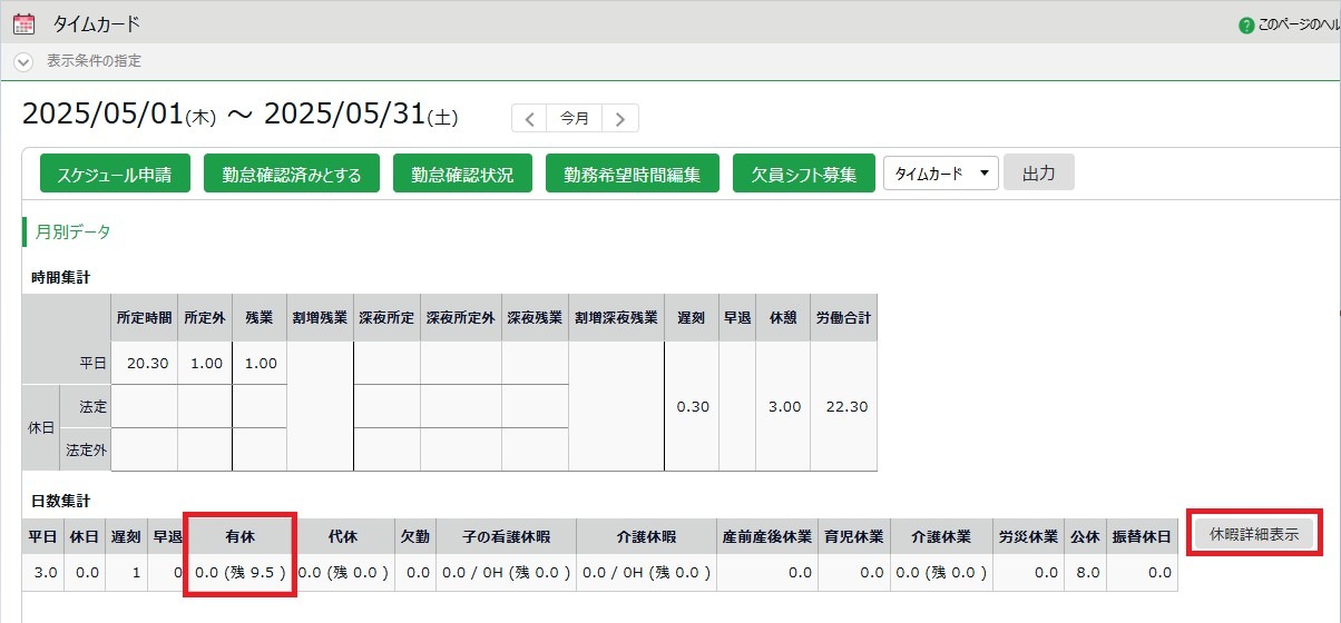 年次有休休暇5日の取得 2025 5/20 勤怠管理マニュアル 2025年5月20日 1年に10日以上の年休が付与されている従業員は、1年以内に5日以上の年休取得が必要です。 STEPタイムカード画面 タイムカード画面より有休の取得日数及び残日数が確認できます。 また、[休暇詳細表示]ボタンより休暇の詳細情報を確認できます。 STEP休暇詳細画面 取得日や有効期限を確認できます。 勤怠管理マニュアル