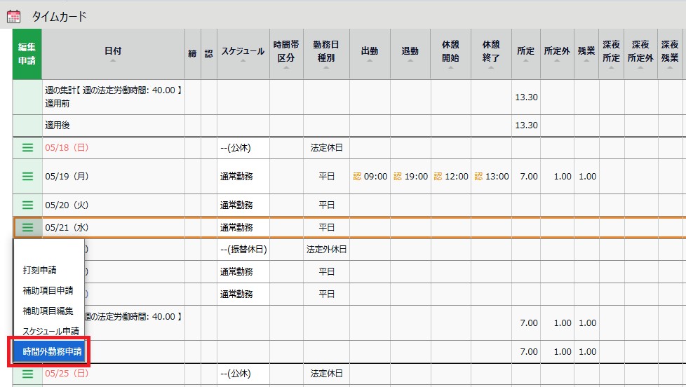 タイムカードの日別データにある左の三本線から「スケジュール申請」を選択します。