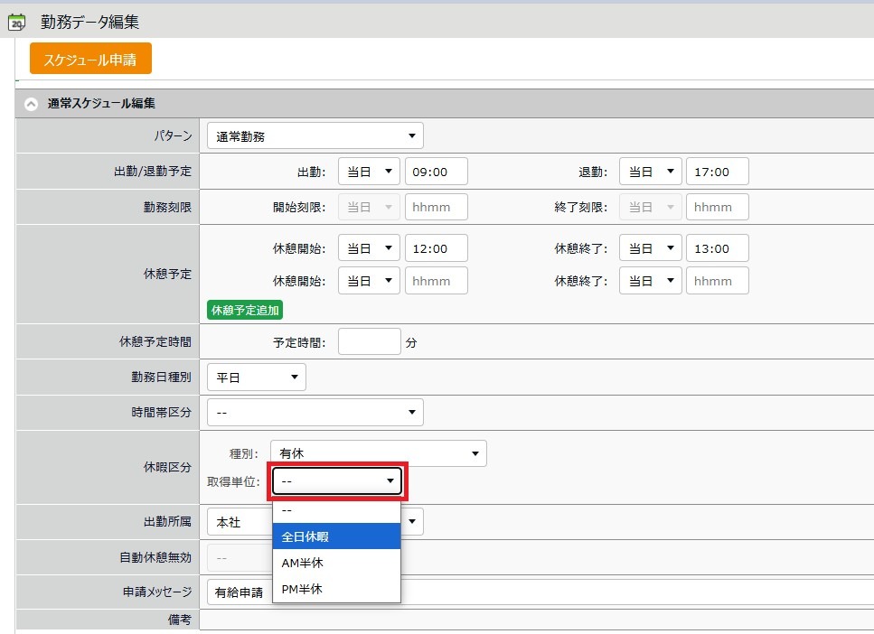 取得する休暇に応じた[取得単位]を選択します。休暇ごとの取得単位は、就業規則を確認してください。