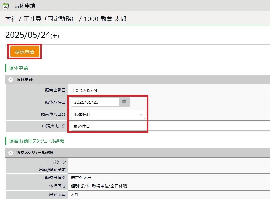 休日出勤が発生する場合は、「振休申請」を行ってください。(月を跨ぐ振休申請はしないようにお願いします。)また、振休申請の承認後に「スケジュール申請」を行ってください。