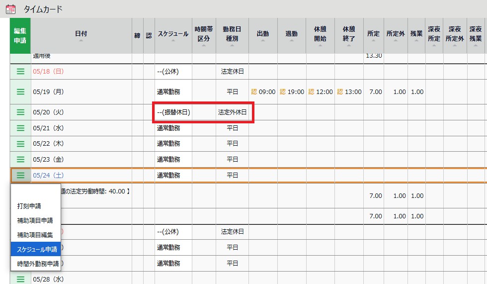 「振休申請」は、休日出勤する公休(土曜日、日曜日、祝日)のみ表示されます。