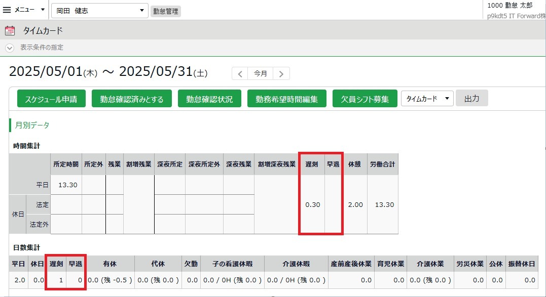 遅刻や早退をした場合 2025 5/19 勤怠管理マニュアル 2025年5月19日 遅刻や早退は、自動的に時間集計されます。打刻に間違いがある場合は、打刻申請から修正をしてください。 STEP月別データ 月別データでは、遅刻時間や早退時間の集計値を確認できます。 STEP日別データ 日別データでは、日ごとの遅刻時間や早退時間を確認できます。 出勤打刻や退勤打刻に間違いがある場合は、打刻申請から修正をしてください。 勤怠管理マニュアル