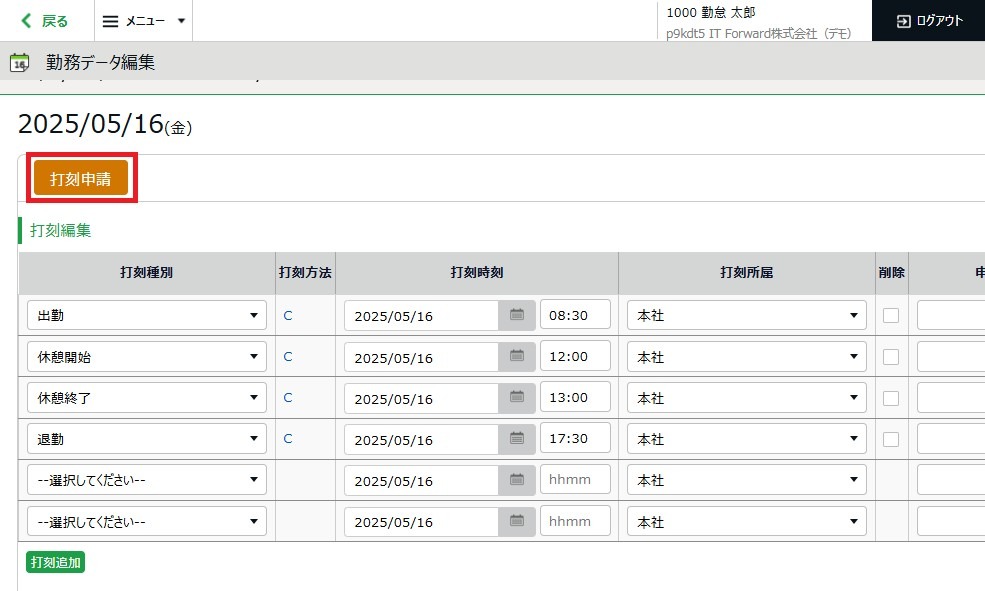 打刻種別から「出勤」や「退勤」を選択し、打刻時刻と申請メッセージを入力し、[打刻申請]をクリックします。